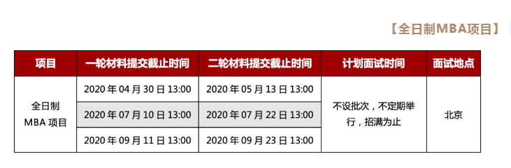 2021年全日制MBA项目的一轮材料提交最终截止时间为2020年09月11日13:00,二轮材料提交最终截止时间为2020年09月23日13:00,