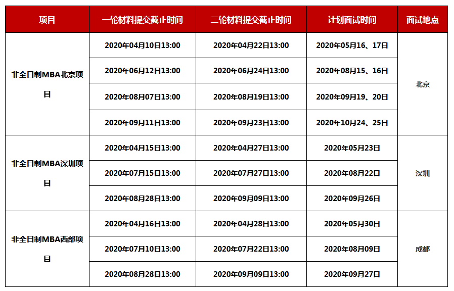 2021年非全日制MBA北京项目的一轮材料提交最终截止时间为2020年09月11日13:00,二轮材料提交最终截止时间为2020年09月23日13:00;
