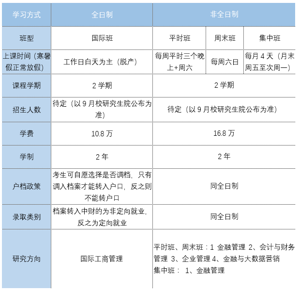 4、关于学习方式:全日制和非全日制的选择:考生在提前批申请材料中,必须选择学习方式,且必须与通过中国研究生招生信息网(简称研招网,教育部指定网站)报名时(一般在10月)选择的学习方式一致。即,在提前批选择了全日制,在研招网报名时也必须选择全日制,非全日制同理。如果不一致,已经取得的A类预录取资格降为B类预录取资格;已经取得的B类预录取资格降为无提前批面试成绩,只能在联考成绩达到中财MBA复试分数线后,参加正常批复试。