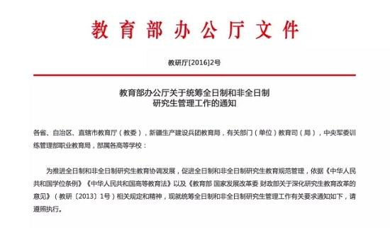 《通知》强调,全日制和非全日制研究生实行相同的考试招生政策和培养标准。